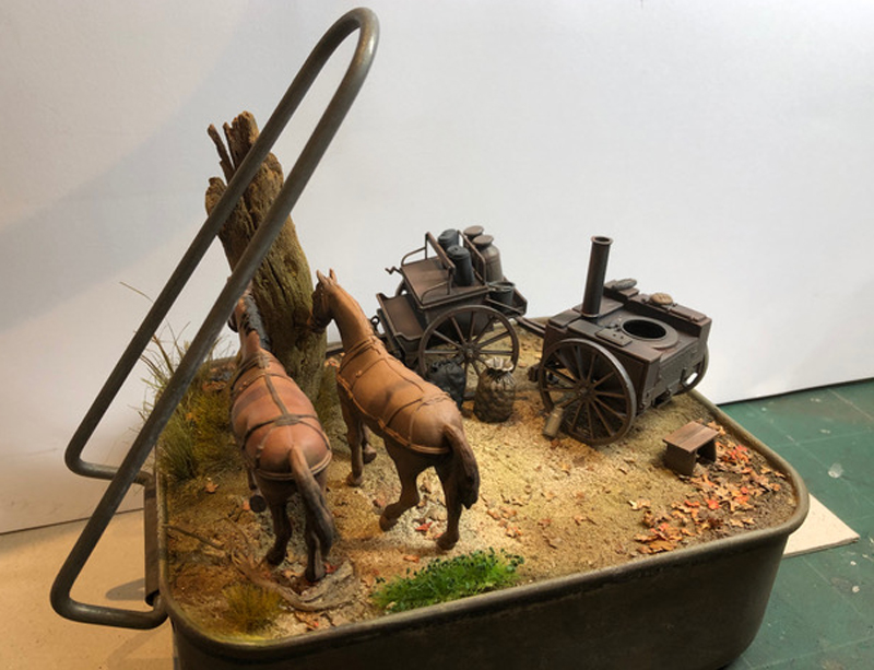 Nu de regio-avonden zijn stilgelegd is het leuk om toch nog contact met elkaar te houden. Chris kwam met het idee een webpagina te maken waar iedereen kleine updates van zijn modelbouwavonturen kan posten. We voegen de updates op volgorde van datum toe. We hebben tot nu 202 bijdragen met 552 foto's ontvangen. Als je wat hebt, stuur het naar Rob de Bie, en het wordt toegevoegd. Alles is welkom, je kunt hier bijvoorbeeld andere dingen laten zien dan op een regioavond. 26 mei 2021Annamarie Jongbloed: "Voor mijn volgende diorama-project heb ik me laten inspireren door een militair etensblik, dat ik op Marktplaats heb aangeschaft. Voor het diorama heb ik de 'Feldkuche' van het merk Tamiya in schaal 1/35 gebruikt, inclusief paarden, personeel en manschappen. In het Duitse leger was het beter bekend als 'Gulaschkanone' omdat het net als een kanon door een span paarden getrokken werd, en een lange schoorsteen ('loop') had. De dode boom is een hier in de omtrek gevonden spruitenstronk. Een paar maanden nadat de spruiten zijn gerooid, zijn de stronken zodanig verhout dat ze prima als boomstronken te gebruiken zijn. De Feldkuche is op het verweren na klaar. De paarden en de figuren kregen een basiskleur en worden afgewerkt met veel dunne laagjes Vallejo en wat olieverf. Het geheel krijgt heel toepasselijk de titel: 'Eten uit Blik'. "