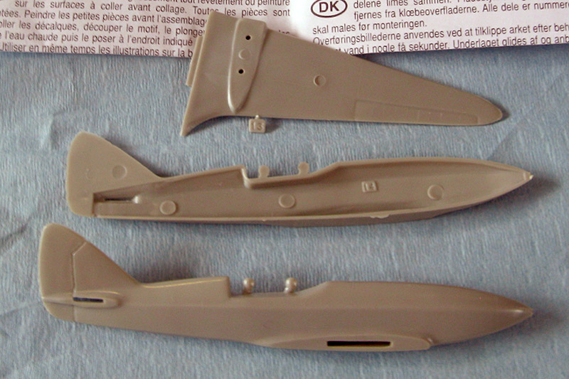 "Aan de onderkant hoort het kruis halverwege de spanwijdte te zitten, maar ook dat is niet gedaan. Er is voor dezelfde positie als aan de bovenkant gekozen. De 'binnenste' letters zijn naar voren geschoven, waarschijnlijk om de flap vrij te houden. De 'K' moet ik zodoende nog wat verplaatsten, want die valt nog steeds op de flap. De buitenste letters zijn een graad of 5 gedraaid, om mij niet bekende redenen. Ik denk dat ik het decaltekenwerk nu voldoende heb gecontroleerd. Het model is overigens oorspronkelijk van het Japanse merk Trimaster uit 1990, en was toen zowel baanbrekend en duur. Na het faillisement van Trimaster heeft Dragon uit Hong-Kong de mallen gekocht en het model opnieuw uitgegeven. Later is het ook onder de vlag van Revell uitgekomen, in 1999. Ik heb die laatste versie, en tot nu toe vind ik het een fraai model zonder grote problemen."