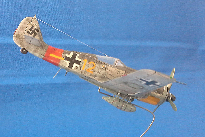 8 september 2020Brian Kirwan: "Hier is mijn Eduard 1/72 Fw 190A-8/R2. Dit is een schitterende kit en ik heb er al twee gebouwd. Het onderstel is erg zwak; kenners van de Fw190 weten dat het onderstel nogal complex is en ik had geen zin om te vechten met het ding. Ik heb daarom besloten mijn model als 'vliegend' model te maken. Ik heb deze Fw 190 gebouwd als Werknummer 682958, zoals gevlogen door Unteroffizier Paul Lixfeld, van 6.(Sturm)/ JG 300 op het vliegveld van Löbnitz, in december 1944. De verwering is authentiek voor dit toestel, gebaseerd op meerdere foto's in het boek 'Jagdgeschwader 300 Wilde Sau - Volume Two'. De basis is een omgedraaid bamboe serveerkommetje van de Xenos, met een schijfje lood als extra gewicht. Het 'Wilde Sau' embleem kwam van het internet en is geplastificeerd."