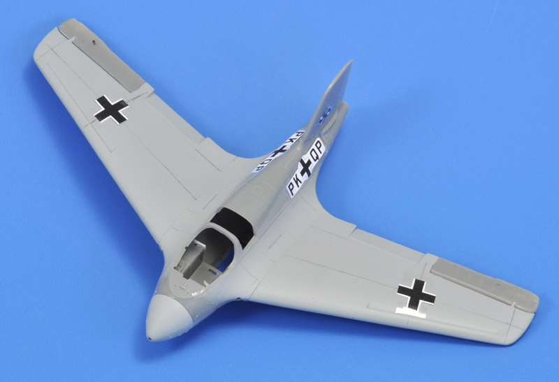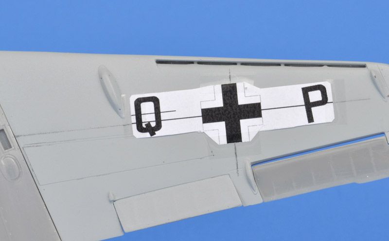 18 september 2020Rob de Bie: "In 1998 ben ik een website begonnen over de Messerschmitt Me 163B Komet, het enige operationele raket-aangedreven gevechtsvliegtuig van de tweede wereldoorlog. Ondertussen is die site zo'n 1400 pagina's groot gegroeid. Eén van de resultaten was dat ik de levensloop van een specifieke Komet heb kunnen reconstrueren met ongeveer dertig foto's. Van die Komet, met Werknummer 310054, Versuchnummer V-45 en Stammkennzeichen PK+QP, wil ik een 1/48 model maken. De decals heb ik zelf ontworpen, na lange studie van de foto's en filmbeelden (zie bijvoorbeeld Messerschmitt Me-163B Komet Testing op YouTube, met vanaf 4:00 deze specifieke Komet). Ik heb deze decals nu op papier geprint om ze nog een laatste keer te testen op het model. De Duitsers hadden natuurlijk strenge instructies voor de markeringen, maar die zijn slechts deels opgevolgd bij deze Komet. De markeringen moesten op de helft van de vleugelkoorde worden aangebracht, waarbij de stuurvlakken niet meetelden. Ik heb die lijn met een potloodlijn aangegeven. Het kruis moet op 2 meter van de vleugeltip worden aangebracht, maar daarvan is -10% afgeweken. Ook zou het kruis in vliegrichting moeten staan, maar die instructie was misschien bedacht voordat er pijlvleugels kwamen, en is dus ook niet uitgevoerd."