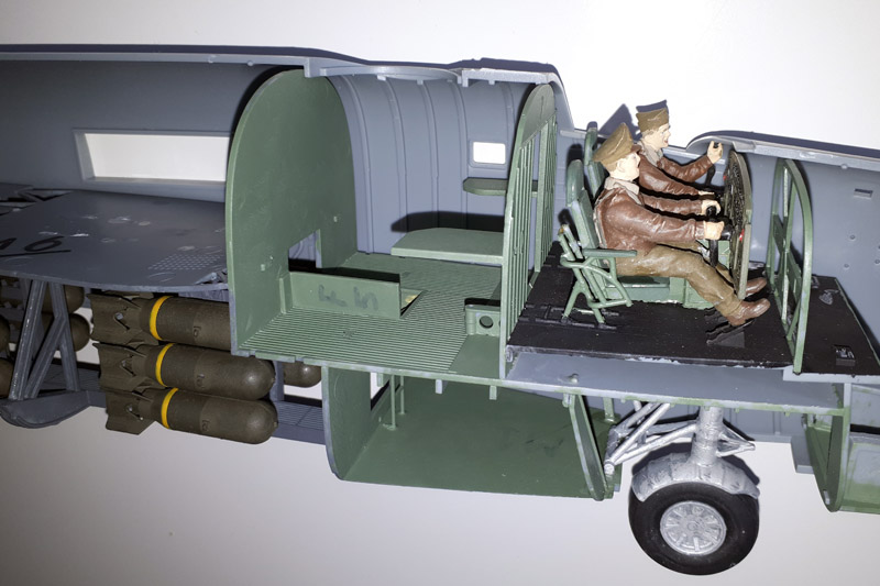 28 september 2020Edu de Roos: "Ik heb deze periode toch nog wat tijd gehad weer een paar nieuwe projecten te starten. Mocht je denken dat pensionado's gedurende de coronatijd alle tijd hebben de voorraad modelbouwdozen weg te werken, dan kom je bedrogen uit. Zo valt er in en rond het huis nog wel het een en ander te doen en in mijn geval ook nog wat oldtimers die aandacht verdienen. Bovendien heb ik ook nog een collectie tinnen en resin figuren die voor een groot deel zelf geschilderd zijn of moeten worden. Qua werk maakt het geen verschil, maar een plastic figuurtje kan weer wel voor de IPMS, maar een tinnen uiteraard niet. Toch neem ik stiekem wel eens een tinnen figuurtje mee en zo lang het niet opgetild wordt ziet, eenmaal geschilderd, niemand het verschil." "Het meest opvallende project waar ik deze periode aan beginnen ben is de B-24 Liberator schaal 1/32 van Hobby Boss. Over de geschiedenis van deze vliegende doodkisten of 'widow makers' met een productieaantal van meer dan 18.000 en een crew van 11 hoef ik niets te vertellen, dat is algemeen bekend. Was de 1/32 Avro Lancaster van de firma Hong Kong Models qua omvang een uitdaging, de B24 is ongeveer net zo lang maar ruim 10 centimeter breder. Het interieur van deze B-24 is vrij pover, maar eenmaal dicht zie je er sowieso niet zoveel meer van. Daar de B-24 naast de Lancaster een plekje krijgt aan het plafond, zijn er ook een paar piloten in de cockpit geplaatst. Deze zijn uit de set 'USAAF Pilots (1941-1945)' van ICM, echter dit zijn lopende figuurtjes, maar met wat zaag- en plakwerk heb ik ze toch zittend gekregen."