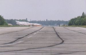 A few auxiliary airfields are known in East Germany. One was found inside a training ground at the Magdeburger Heide. It had an unpaved runway. The other large training grounds were also reported to have unpaved runways. The only auxiliary airfield with a paved runway was Haina, which I visited. It had a 2.2 km concrete runway, and a parallel taxiway with a flightline. It was rumoured that this airfield was sometimes used by MiG 25's. On the east side of the city of Prenzlau, another former Russian air base can be found. It used to house the helicopter unit that moved on the Templin, and then Werneuchen.