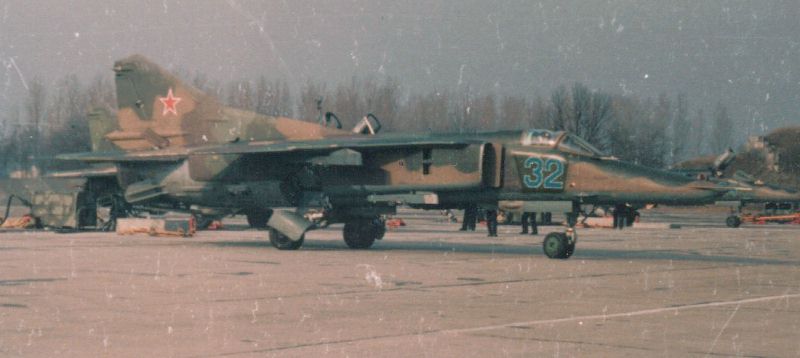 Slightly damaged, but nevertheless a very nice photo of MiG 27D '32', probably pictured just leaving its spot on the flightline. Note the MiG 23UB behind it, and the MiG 27D '24' to the right.