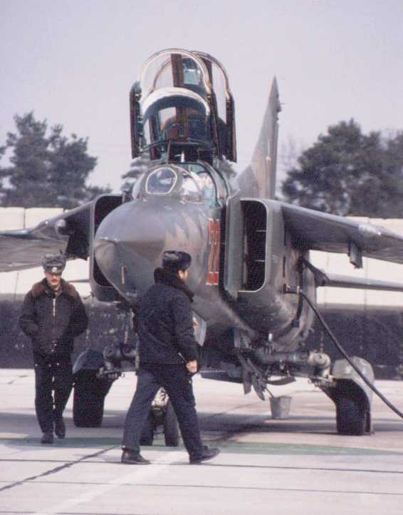 MiG 23UB 'Red 22' (c/n 1905) of 787IAP at Finow, being prepared for one of its last flights from German soil.