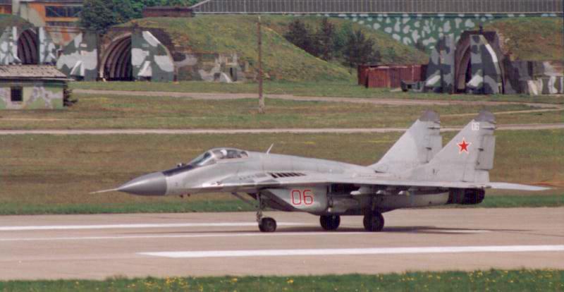 MiG 29 Fulcrum-C 'Red 06' coming to a halt at Falkenberg runway. Note the three shelters and another camouflaged hanger in the background.