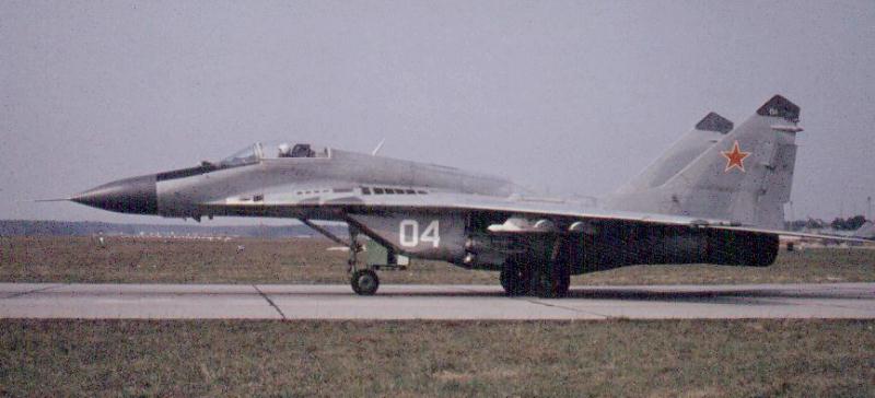 MiG 29 Fulcrum-C 'White 04' (c/n 07727) of 787IAP taxying to the Finow runway. The flightline can be seen in the background on the right.