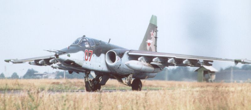 Su 25 'Red 07' taxying to the Brandis runway on a morning mission. It carries a Kh-25ML laser-guided missile under the right wing, in addition to two fuel tanks.