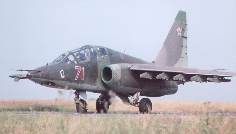 Two seat Su 25UB 'Red 71' on the Brandis taxiway. The demarcation line between the upper and lower camouflage sits rather low on this example.