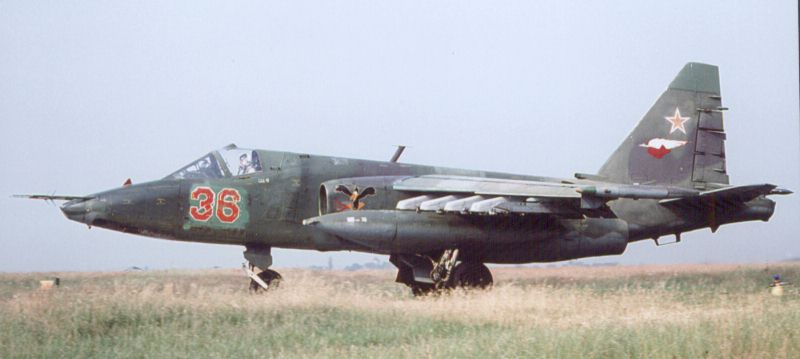 Green-and-green camouflaged Su 25 'Red 36' (previously '23') waiting for permission to taxi on the runway. I believe there were only two Frogfoots camouflaged like this at Brandis.