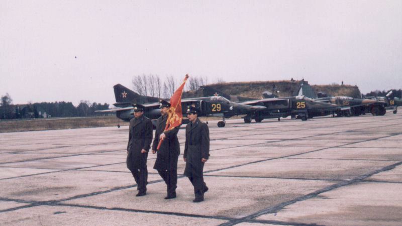 Lindsay writes: "Lärz's 19th Fighter-Bomber Regiment banner being paraded down the flight line on departure day in March 1993." Note the two shelters positioned along the flight line.