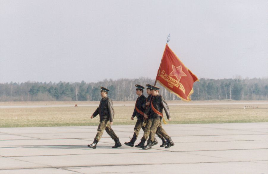 The 33rd Regiment's banner is paraded for the final time in Germany shortly after the last MiG-29 had flown out of Wittstock on 7 April 1994. The honour party had been present near the end of the runway and dipped the banner in salute as each MiG-29 taxied by.