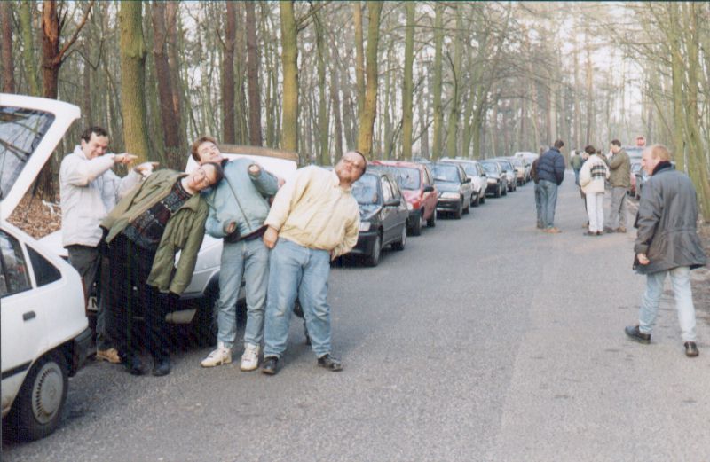 Early in the morning of 7 April 1994, a line of cars is waiting to be admitted to the base, to see the departure of the 33 IAP MiG-29s to Damgarten. At left, a small group of Brits can be seen in "total idiot mode" as they wait for the gates to open. On the right, a passing Dutchman looks bewildered by their strange behaviour.